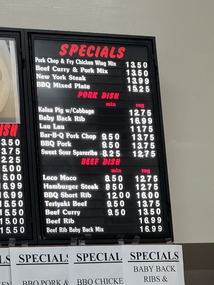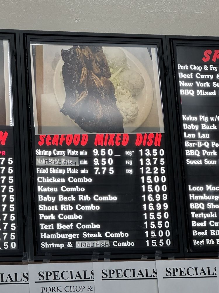 Your choice of () pan of BBQ short ribs or teriyaki steak, () pan of fried shrimp or fried fish, () pan of BBQ chicken, () pan of chicken katsu, () pan of macaroni salad, and () pan of white rice.