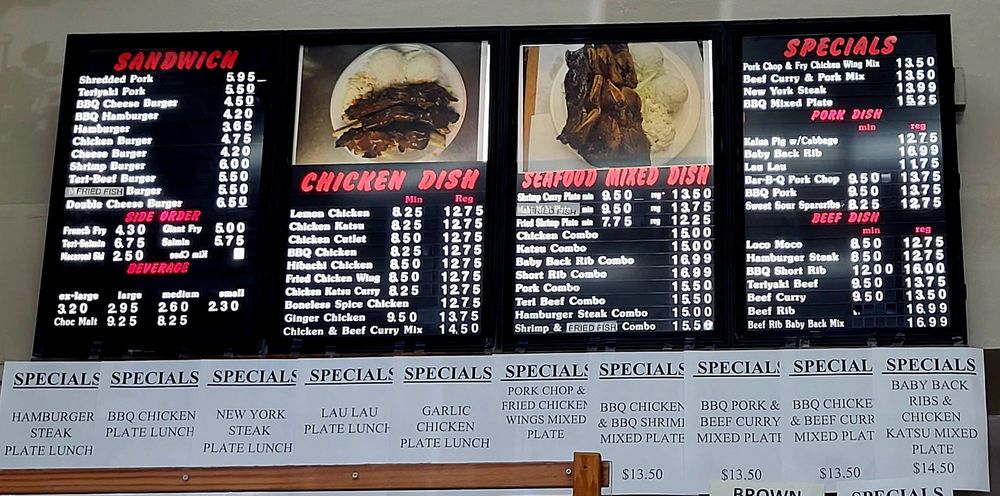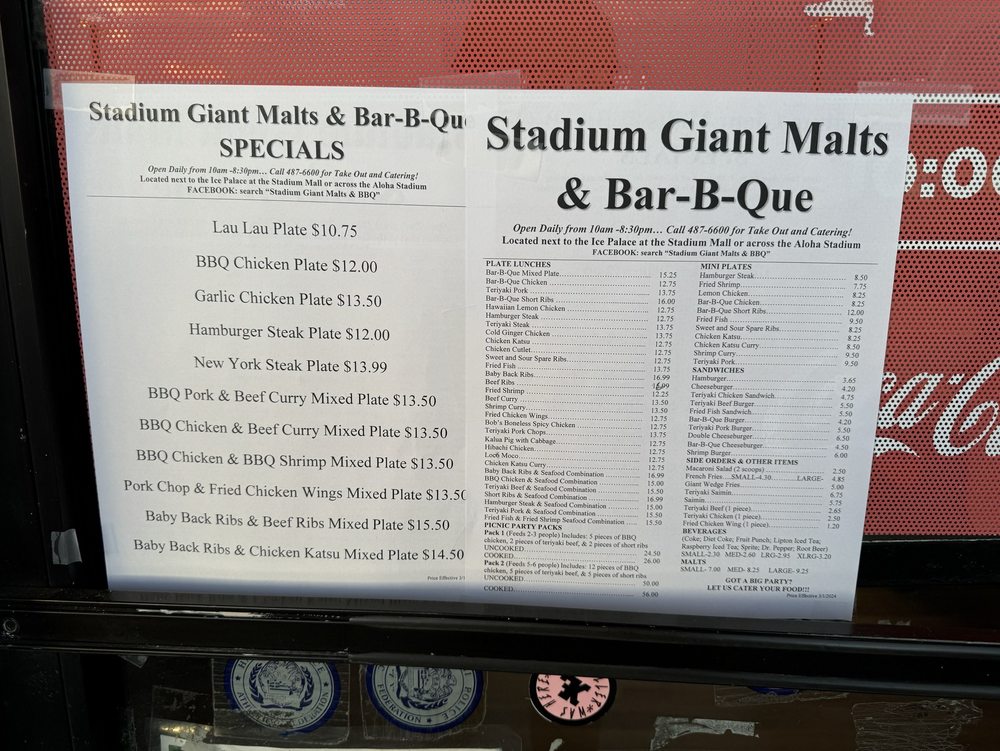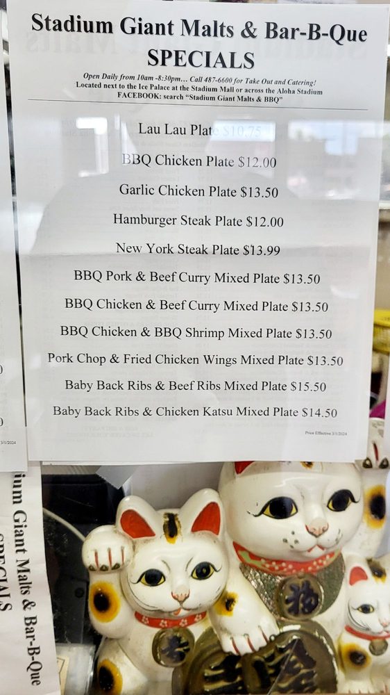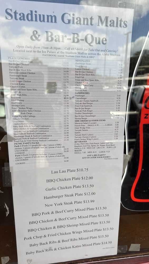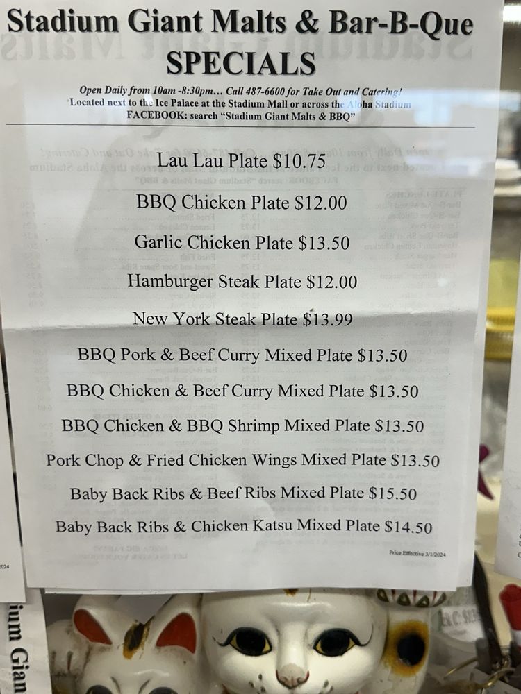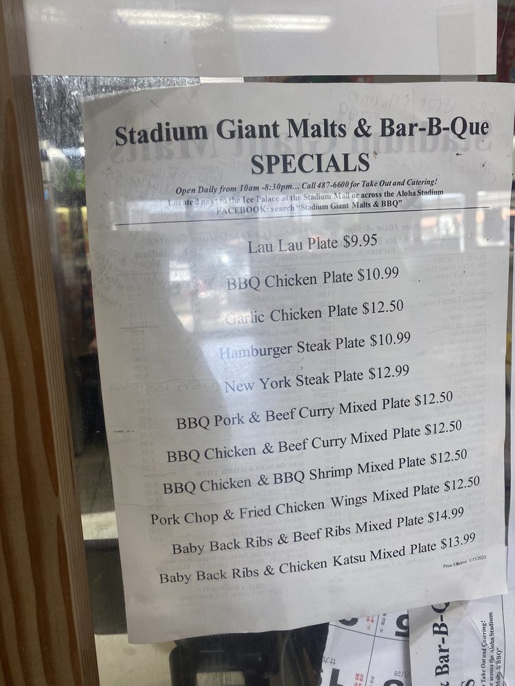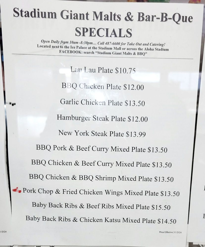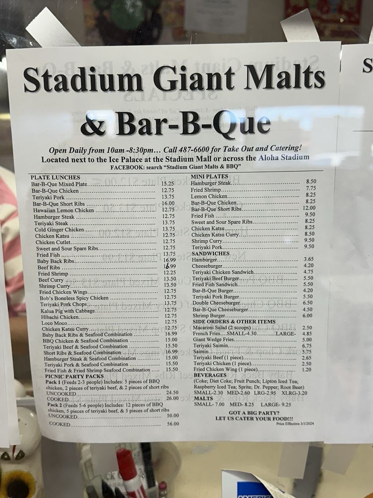 Stadium Giant Malts in Honolulu offers a variety of barbeque, sandwiches, and burgers. With options for delivery, takeout, and vegetarian choices, this casual spot is perfect for lunch or dinner. The fried chicken wings are a standout, made to order and satisfyingly crispy. The homemade hamburger steak plate receives mixed reviews, with some finding the gravy underwhelming. The old-school self-service style adds to the charm, but parking can be a challenge due to the busy location at Stadium Mall. The malt drinks are described as nostalgic and refreshing, making them a must-try. While not ideal for large groups, Stadium Giant Malts is a favorite among locals for its decent prices and generous portions. Whether dining in, taking out, or ordering delivery, this spot is worth a visit for a taste of classic comfort food.